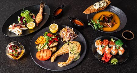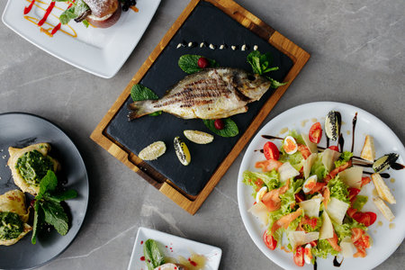 Mix of different dishes at the restaurant. Dishes on gray background.Delicious dorado baked on a grill with spices and herbs. gray background. copyspace.