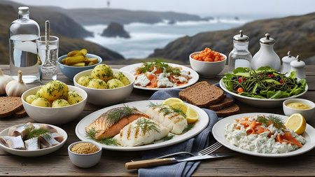 A bountiful table is set with a Scandinavian-inspired seafood feast, featuring salmon, pickled herring, and boiled potatoes with dill. The meal is presented outdoors against a scenic, blurred coastal landscape, evoking a sense of fresh, healthy dining.