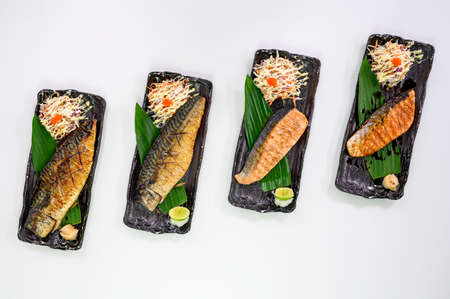 Grilled saba with salmon smoked with vegetable on ceramic dish
