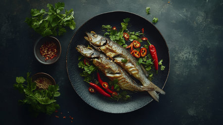 A top-down view of a beautifully plated fried seabass with fish sauce, garnished with fresh herbs and sliced chilies, reflecting the elegance of Thai cuisine