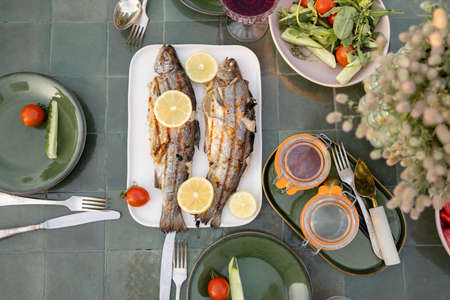 Grilled trout fish on a beautifully served green table outdoors, view from above