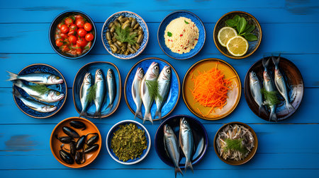 A set of sardine fish, snacks and dishes in plates on blue wooden background. Top view. Mediterranean food banner.