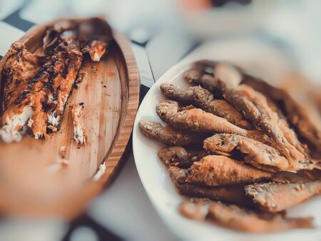 Fried rice and small fish in plate on table. Bay leaves and lemon. Outdoors Food.