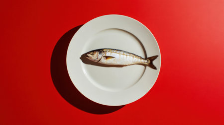 This image features a fresh fish placed elegantly on a white plate, contrasting vividly against a bold red background, ideal for food-related content.