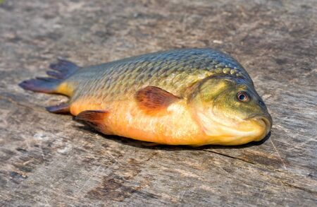 Close up view of a freshly caught freshwater fish on a stone.