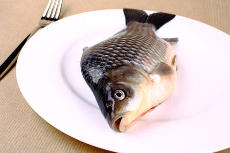 fresh fish carp on white plate