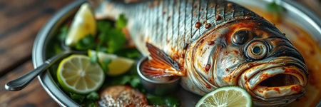 Fresh seafood catch of fish, healthy gourmet meal with vegetables generated by artificial intelligence