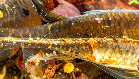 A close-up view captures the delicious texture of freshly cooked fish, generously coated in a vibrant mix of aromatic spices and herbs. This traditional dish promises a flavorful and authentic culinary journey, perfect for food lovers.