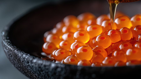 This close-up image features vibrant salmon roe drizzled with soy sauce, showcasing the glossy texture and rich color that enhances any gourmet dish.