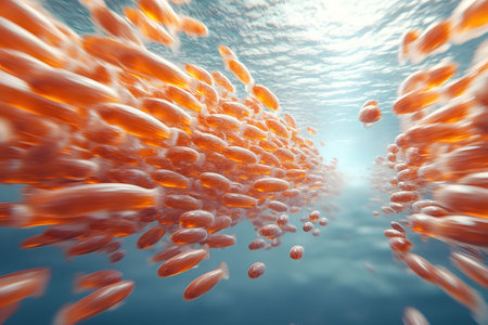 A stunning underwater view showcasing a large school of orange fish swimming in unison, fluid motion and natural harmony. the sunlight dances through the clear water, creating a serene and vibrant marine scene. Generative AI