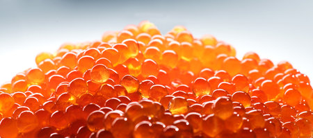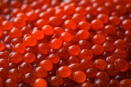 A captivating close-up shot of vibrant salmon roe, showcasing the delicate and glossy texture. This stunning image highlights the art of sushi preparation and presentation, perfect for culinary enthusiasts and food photography lovers.
