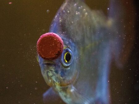 Large, Silver Dollar, fish enjoy treats that have been stuck to the glass inside a common type of fish tank.