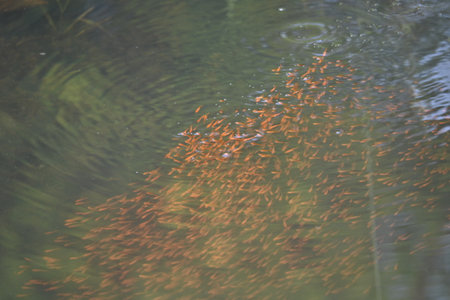 Little red fish are playing in water. A school of newborn red fish is swimming in the river where they live. Marine life. Aquatic creatures.