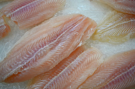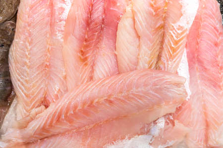 fresh-caught seafood, raw tilapia fillet fish on ice at the fish market, background