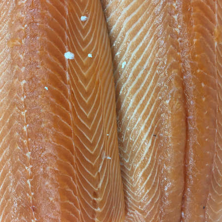 Prepared pieces of delicious fresh salmon gourmet fish fillet. Traditional healthy sea food from seafood market with orange white stripes pattern. Quality food for sushi lunch or barbecue dinner.