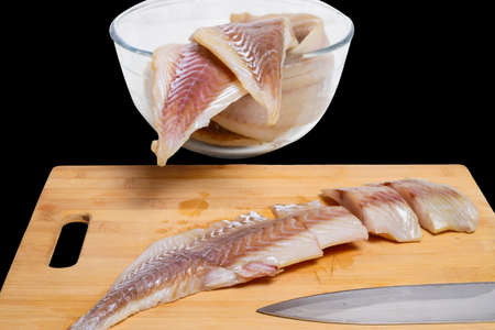 Two filet fish hare, rabbit fish on a cutting board in macro. Dorado fillet, telapia. Raw fish, seafood in macro. Top and side view