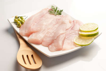 fresh raw pangasius fish fillet with herb and spices lemon lime and rosemary, meat dolly fish tilapia striped catfish, fish fillet on white plate with ingredients for cooking - top view