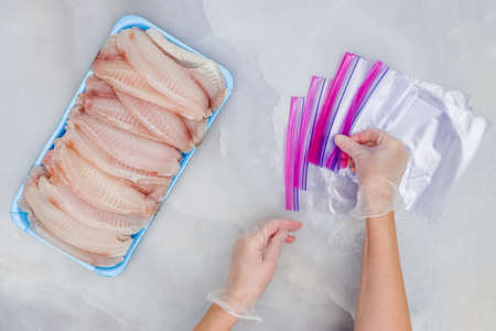 Woman hands put fresh Tilapia fish fillet in zip lock bags for freezing, close up view from above