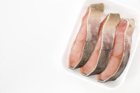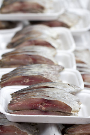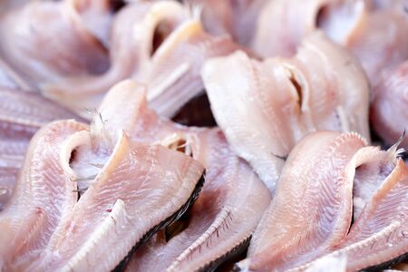 Lot of fish fillets lying on the counter in the shop window. Close-up, selective focus.