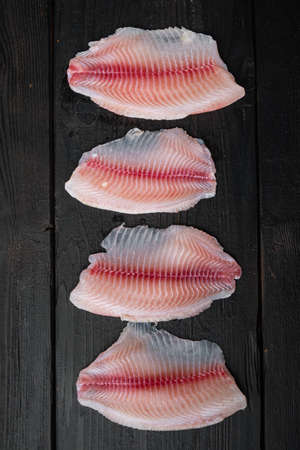 Close-up of raw fresh fillet of tilapia fish, overhead shot
