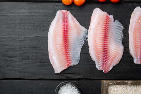 Raw white fish tilapia, with basmati rice and cherry tomatoes ingredients, on black wooden table, top view with copy space for text