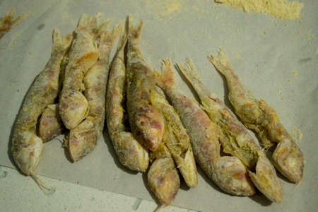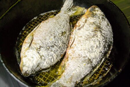 Sea fish fried in a pan with six spices