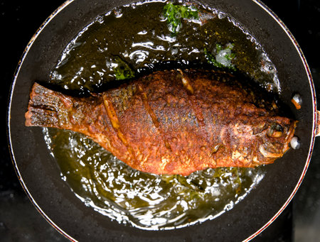A perfectly seasoned whole fish sizzles in hot oil, ready to be served for a delicious meal.