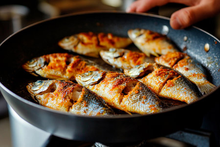 Pan-frying or home cooking Fried Tilapia on a stove.