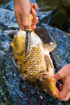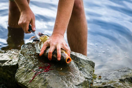 Fisherman filleting freshly caught freshwater carp, fisherman and his catch