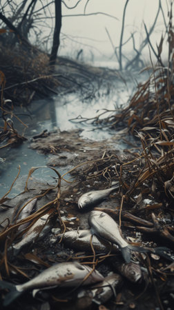 close-up of dead fish on the riverbed, killed by toxic runoff, created with generative ai