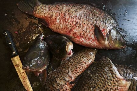 Freshly peeled carp fish on the table