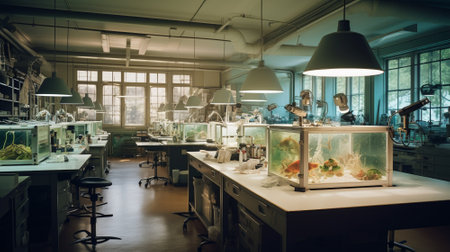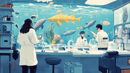 In a vibrant laboratory setting, two scientists observe and analyze various species of fish swimming in a large aquatic tank, showcasing innovative research in marine biology.
