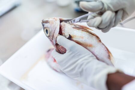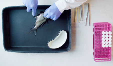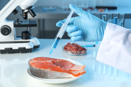 Scientist injecting something into piece of salmon at table in laboratory, closeup