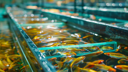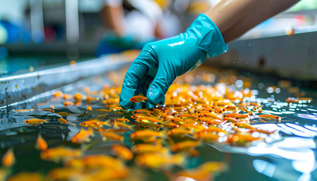 A gloved hand carefully sorts through a teeming school of young goldfish at a commercial aquaculture facility. This close-up shot highlights the process of quality control and care in the fish farming industry, from hatchery to pet store.