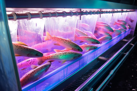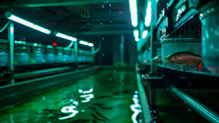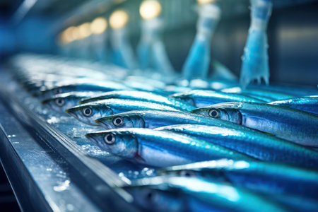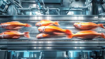 Freshly caught redfish are transported on a conveyor belt in a modern fish processing plant, ensuring efficient seafood production. Generative ai