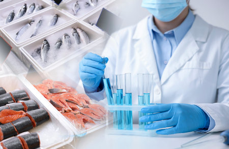 Laboratory food analysis. Expert holding test tube, multiple exposure with seafood