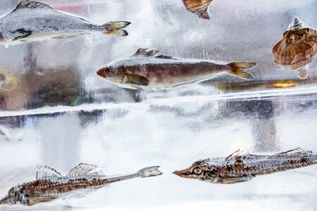 Fresh Fish On Display On Ice On Fishermen Market Store Shop. Seafood