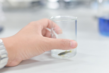 Blurred of young woman and man scientist brainstorm and discuss about fish (siamese fighting fish and golden fish) disease in the marine lab as teamwork with the foreground of fish tank