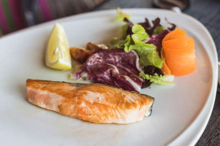 Salmon grilled on the white plate, serve with vegetables and lemon.