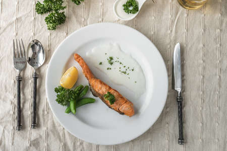 Salmon in lemon sauce. Appetizing dinner dish served with salad and bread. Food photography, food styling.
