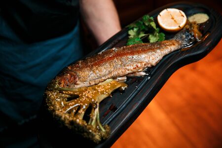 The waiter is holding a plate Dorado with arugula and lemon. BBQ seafood. Restaurant menu