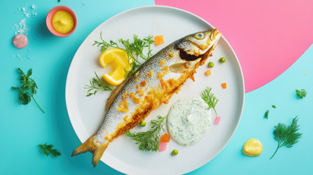 A beautifully presented whole grilled fish garnished with fresh herbs and lemon wedges, showcasing a modern and vibrant culinary style perfect for food enthusiasts.