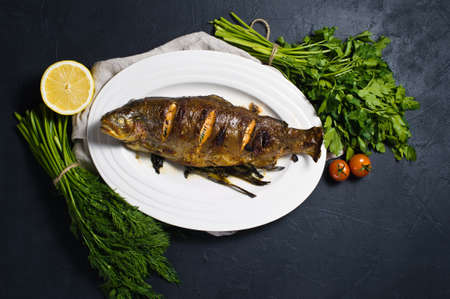 Grilled trout on a white plate, sprigs of dill and parsley. Black background, top view