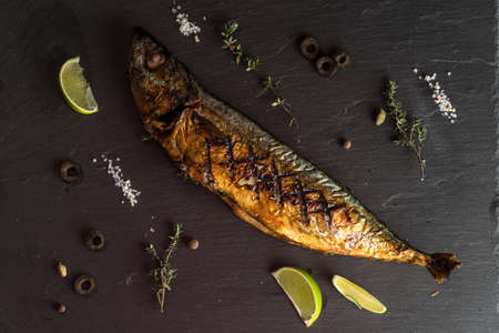 Delicious fresh fish on dark vintage background. Fish with aromatic herbs, spices and vegetables - healthy food, diet or cooking concept
