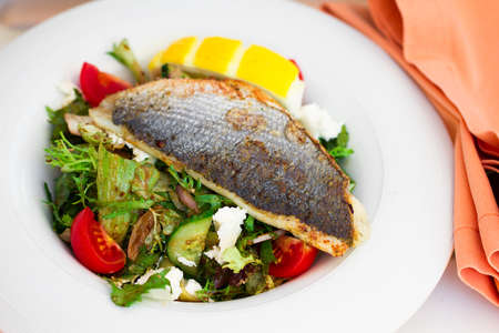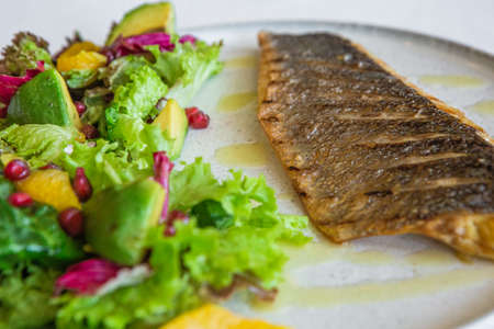 Grilled sea brass with crispy powder serving with fresh salad amd mash potato on white plate