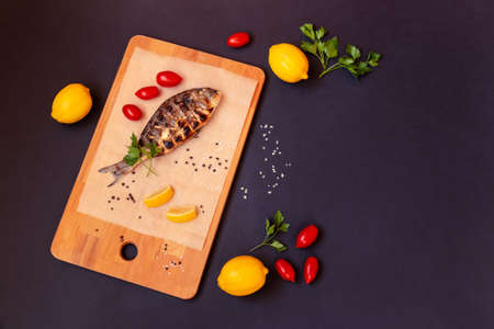 Delicious roasted dorado fish with lemon and tomatoes on cutting board on dark background, lemon, parsley and tomatoes near. View from above, copy space.