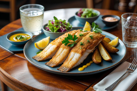 Elegant luxury dining with gourmet cuisine and wine in a cozy restaurant. Culinary delight captured in ambient lighting. Food catering and English cuisine