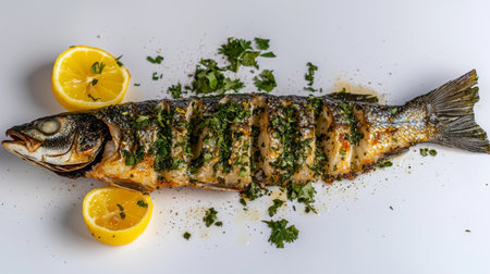 A beautifully grilled whole fish served on a white plate, accompanied by lemon slices, fresh herbs, and spices, showcasing vibrant colors and flavors.
