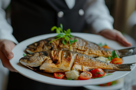Freshly Grilled Fish Served on White Plate with Vegetables by Waiter in Fine Dining Restaurant.