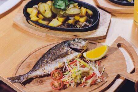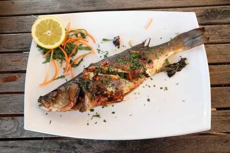 Grilled sea bass Fish plate on wooden table ,serving in maltese restaurant